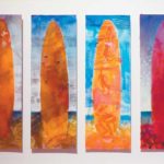 Bennett’s pieces for “Surfing Hawai’i” are strong and massive. Two real-size representations of surfboards at 8-feet-6-inches tall bookend her wall in the exhibit. When seen from a distance, the boards appear to be simple, colorful beachy images. The real delight in her work is at closer inspection. As one approaches, details are uncovered, telling a more satisfying story, and as Bennett relayed, “secrets are revealed.”