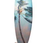 Lyon is equally known for his striking palm tree images. For the “Surfing Hawai’i” show, he painted “Pleasure Craft” on a surfboard, wrapping the palm fronds around to the back of the board — ‘like a hug,’ he described, chuckling.