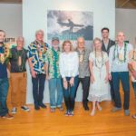 - Artists Noble Richardson (from left), Pete Cabrinha, Mark Cunningham, Bob “Ole” Olson, Schaefer Director Neida Bangerter, Wayne Levin, Carol Bennett, Peter Shepard Cole, Charlie Lyon and Pohaku Stone at the exhibit opening in December. — Photo courtesy Schaefer International Gallery