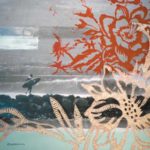He has built up a large portfolio of images, which he now uses in his work. Using block print, silkscreen, paint and, most recently, carving into the wood canvas, Cabrinha builds arresting collage pieces.