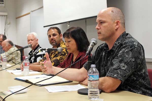- Maui County Energy Commissioner Fred Redell (from right), Maui Electric Co. President Sharon Suzuki, MECO Power Supply Manager Mat McNeff and Maui Tomorrow Vice President Doug McLeod discuss Maui’s path to 100 percent renewable energy during a community forum Thursday night at the Kaunoa Senior Center in Spreckelsville. The Maui News / COLLEEN UECHI photo