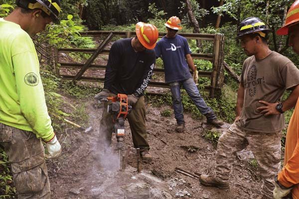 Participants in the Hawaii Youth Conservation Corps team work with state Department of Land and Natural Resources staff to improve a lower portion of Waihee Ridge Trail over the summer. The department is awaiting approval on plans to improve drainage and install two new observation platforms along the trail, which has been eroded by wear and heavy rains. State Department of Land and Natural Resources photo
