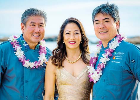 Hawaii Food & Wine Festival Director Denise Yamaguchi is flanked by chefs/ founders Alan Wong (at left) and Roy Yamaguchi. -- HFWF photo
