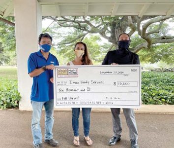 Mahi Pono donated $10,000 to Imua Family Services on Nov. 23, according to a news release. The funds were raised from Mahi Pono’s first annual Fall Harvest which included pumpkin sales on Oct. 24 at Yokouchi Family Estate. The drive-thru festival provided the Maui community with a safe, ohana-friendly way to celebrate Mahi Pono’s first fall harvest while supporting Imua Family Services and its community-based programs. Pictured from left to right are Shan Tsutsui, Mahi Pono senior vice president of operations; Tiare Lawrence, Mahi Pono director of community relations; and Dean Wong, Imua Family Services executive director.