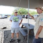 State forest and wildlife technician Joe FellMcDonald (right in first photo) gives Idaho visitor Bob Sojka the latest information on plans to improve a parking lot at the ‘Ahihi-Kina’u Natural Area Reserve on Wednesday morning. Although a flashing sign says that the current rough gravel lot will be closed for construction from September through October, the project is running behind schedule. FellMcDonald said now that all the paperwork has been approved, the job has been turned over to the contractor, and work may start soon. FellMcDonald said the lot averages 1,000 visitors a day, as does the reserve’s other lot at the end of Makena Road. When the lot is closed to be graded, filled and covered with concrete, an alternate parking site will be opened on the other side of Waiala Cove. That lot is expected to accommodate about 20 vehicles. Work to upgrade this parking lot (bottom photo) at ‘Ahihi-Kina’u is expected to start soon. The state Department of Land and Natural Resources will hold a public hearing next month in Kihei on proposed natural area reserve rule amendments, including parking fees for visitors and lot hours at ‘Ahihi-Kina’u.