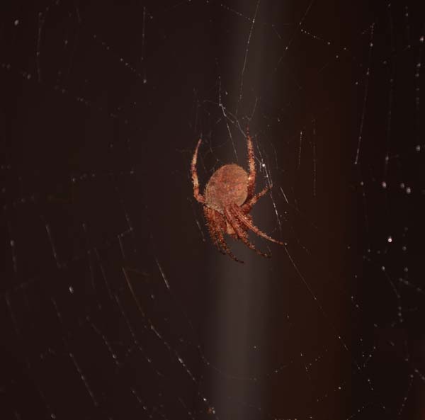 At the center waits a crimson-legged spider ranging in size 1/4 to 3/4 inch long, not including legs. Every evening the weaver returns and rebuilds her web, much to the chagrin of early-rising humans who head out the door and face first into a spiderwebs.