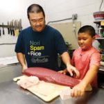 Yokouchi and another worker do most of the fish cutting. When things get really busy, Yokouchi’s 9-year-old son, Brady, helps cut poke cubes.
