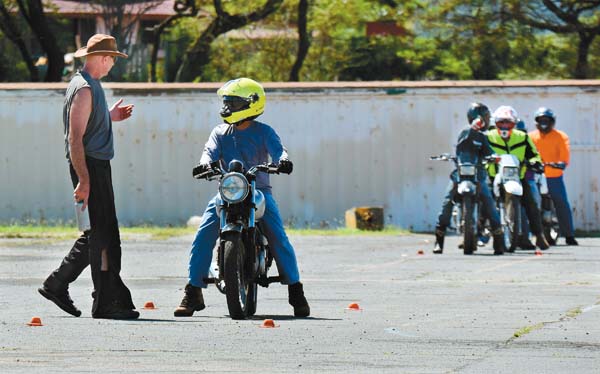 Motorcycle Safety Foundation Basic Rider Course Hawaii instructor Cory Williams (left) works on a braking drill with students Saturday afternoon on the University of Hawaii Maui College campus in Kahului. The course includes two evenings in the classroom and two mornings riding state-provided motorcycles. “This class saves lives,” Williams said. The next class offered by the college’s Edventure program is scheduled for March 2-5, and space is available. For more information, see maui.hawaii.edu.