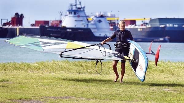 Kuau’s Giampaolo Cammarota carries his windsurfing rig to shore after a session at Kahului Harbor on Thursday afternoon. Cammarota, who works in the rentals department at Hi-Tech Surf Sports, said the foil attached to the bottom of his board may be the next big thing in water sports. The foil provides support, stability and allows riders to stay longer on waves. Cammarota said that as the foils have become popular, especially with stand-up paddleboarders, they have become difficult to keep in stock at the Kahului store. Cammarota posts a Maui surf report at mauisurfreport.blogspot.com.