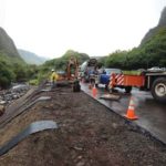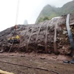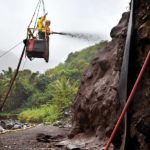 Suspended by a crane in Iao Valley State Monument on Wednesday morning, mason Tim Forcier of Manu Kupono Builders sprays a concrete mixture called “Shotcrete” on a 60-foot-high section of riverbank as co-worker Ha’a Kawaha signals the crane operator to raise them higher. The 410-foot-long section of bank below the monument’s tour bus parking lot and exit lane is being stabilized to prepare for the next phase of the project, a 10-foot stone revetment built at its base. The section of bank was severely eroded during heavy flooding in September. The popular tourist attraction is expected to reopen in June.