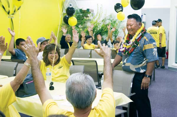 Mayor Alan Arakawa is shown at a 2014 campaign event. The Campaign Spending Commission is investigating post-election expenditures for Arakawa’s campaign including donations to nonprofits listed as advertising. The Maui News / CHRIS SUGIDONO photo
