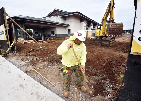 - Rojac Trucking’s James Uweko‘olani clears fill with a shovel Friday afternoon, and Joey Santos Bras uses an excavator as part of a crew prepping for the parking lot and driveways for the new American Savings Bank at the Maui Business Park near Target and Lowe’s. The anticipated opening in May of the new 10,000-square-foot building will coincide with the closing of American Savings’ Kahului Branch on Puunene Avenue. — The Maui News / MATTHEW THAYER photo