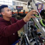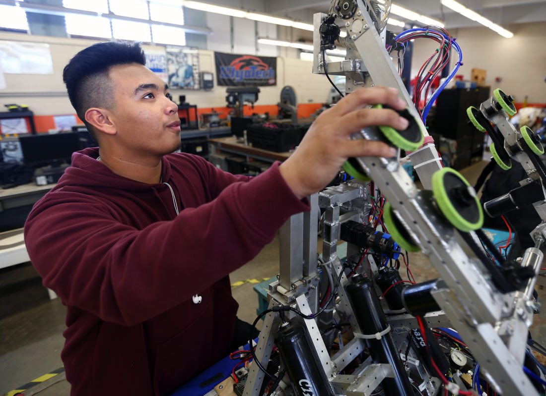 Maui High senior John Fabella examines a robot Tuesday afternoon in the auto classroom. Fabella is one of hundreds of Maui County students planning to walk out of classrooms for 17 minutes on March 14 to recognize the 17 people killed in the Parkland, Fla., school shooting last month. • The Maui News / CHRIS SUGIDONO photo