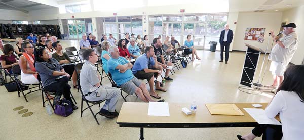 - Mike O’Dwyer, owner of Mulligans on the Blue and Fabiani’s, talks about issues concerning the liquor department during a public meeting Tuesday night at the Kihei Community Center. The Maui News / CHRIS SUGIDONO photos