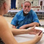 - State Agriculture Department Chairman Scott Enright listens to Lahaina resident Michele Lincoln during an informational outreach meeting for farmers and other agriculture businesses impacted by recent West Maui fires Tuesday evening at Lahaina Intermediate School.