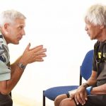 - Jim Horton, director of the National Memorial Cemetery of the Pacific, chats with Abraham “Snake” Ah Hee before Thursday’s meeting at the Kahoohanohano Armory Maui in Kihei. Punchbowl cemetery on Oahu has inurnment eligibility past 2035. — The Maui News / MATTHEW THAYER photo