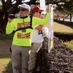 Still, hundreds of residents and visitors, along with three counterprotesters, set up base camp on University of Hawaii Maui College campus with an array of colorful signs, clothes and language. With a prayer by Hawaiian spiritual leader Lei’ohu Ryder and an opening speech emphasizing “aloha for all” by Cantorna, marchers took to the street.