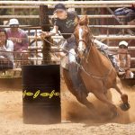 - Lea Bartlet rides in the Wahine Barrel Racing competition July 5 at last year’s Makawao Rodeo at Oskie Rice Arena. With an outbreak of Strangles on the island, contestants in this year’s rodeo from Thursday to July 7 will have to show proof of vaccination. — The Maui News / MATTHEW THAYER photo