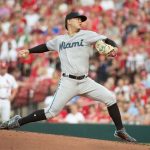 - Marlins starting pitcher Jordan Yamamoto throws during the first inning of Miami’s 6-0 win over the St. Louis Cardinals on Tuesday. Yamamoto has tossed 14 scoreless innings to begin his major league career. AP photos