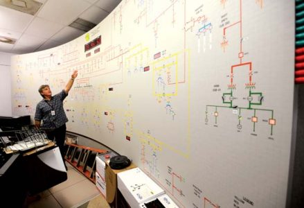 - Maui Electric Co. Director of Operational Technology Chris Reynolds explains the workings of the Transmission Room in Kahului on Wednesday morning. The series of interconnected lights and lines show MECO’s power plants, substations and transmission lines. The red lights indicate where energy is flowing, the green lights where it’s not. — The Maui News / MATTHEW THAYER photo