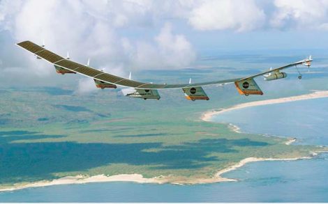Solar panels line the wings, as well as 10 propellers, to keep the lightweight drone flying independently in the stratosphere at about 60 mph.