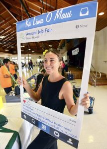 First photo: Maui Kuia Estate Chocolate Director of Sales and Marketing Caitlyn Fisler poses for a framed picture during Ka Lima O Maui’s eighth annual Job Fair at the Binhi At Ani Filipino Community Center in Kahului on Friday morning. Her company was one of about 30 businesses and organizations that attended the fair, hoping to meet and recruit new workers. “We’re just trying to put people to work and encourage an inclusive workforce,” said Ka Lima O Maui Executive Director Chantal Ratte.