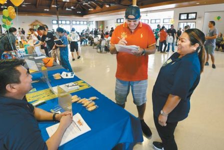 Second photo: Shae Kennedy meets with Hawaii Foodservice Alliance Human Resources Manager Felisa Fuentes-Ikehara (right) and Business Development staffer Blake Ishizu during Friday’s Job Fair.