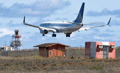 - A United Airlines flight makes its final approach into Kahului Airport on Tuesday. A state project to reconstruct the main runway at the airport would involve closing a portion of the old Haleakala Highway and moving private and charter aircraft to the Kanaha Beach side of the runway. — The Maui News / MATTHEW THAYER photo