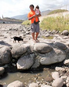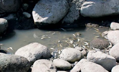 Small piles of dead fish and shrimp were strewn about the riverbed.