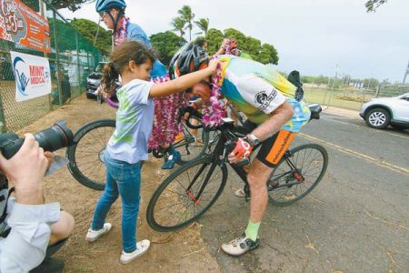 - Hailie Feliciano-Balinbin gives a lei to Mike Gibbons of Haiku as he crosses the finish line of the inaugural Pedal Imua event at the War Memorial Stadium Complex on Sunday. The 60-mile ride started and ended at War Memorial and looped clockwise around the West Maui Mountains. About 100 riders braved the rain, wind and curving road to help raise funds for Dream Imua, a program of Imua Family Services that helps grant wishes to kids who’ve experienced trauma or crises. The Maui News / COLLEEN UECHI photo