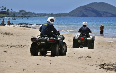 - Maui Police officers patrol Keawakapu Beach in South Maui on Saturday morning, the last day before Mayor Michael Victorino said he would enforce Gov. David Ige’s temporary ban on beach walking, jogging and other exercises. The Maui News / MATTHEW THAYER photo