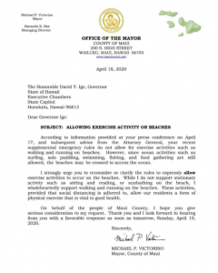 - Mayor Michael Victorino’s letter was posted on the county’s Facebook page Saturday.