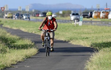 Ronnie Dizon of Wailuku gets some safe exercise while riding on the bike path along Maui Veterans Highway in Puunene on May 12. “I got bored at the house and was gaining weight,” Dizon said. He said he parks his truck by the bike path, which has lately become a popular route for walkers and riders. “It’s a safe place,” he said.
