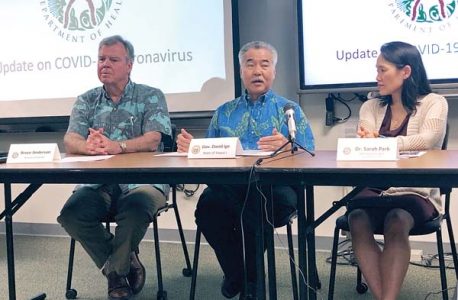 - State Epidemiologist Sarah Park appears at a news conference in February with state Health Director Bruce Anderson (left) and Gov. David Ige. — AP photo