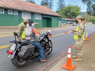 Hawaii National Guard Sgt. Adrien Delos Santos talks to a motorcyclist stopped at a roadblock Saturday on Piilani Highway in Ulupalakua. Delos Santos and Spc. Mitchell Kamei (right) of the National Guard’s Task Force Maui Bravo Company were staffing the roadblock, set up in mid-April to limit travel to East Maui to residents, first responders and deliveries. Traffic was busy at the roadblock near Ulupalakua Ranch Store, which has reopened its grill and outdoor eating tables. The roadblocks in Ulupalakua and at Twin Falls were temporarily abandoned last week but went back up Friday, according to Mayor Michael Victorino. The Maui News / LILA FUJIMOTO photo