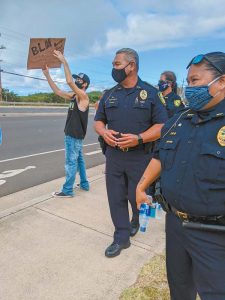 - Police Chief Tivoli Faaumu approaches sign-wavers on Kaahumanu Avenue during a June 1 protest advocating justice for George Floyd, an African-American man who died after being arrested by Minneapolis police officers. The Maui News LILA FUJIMOTO photo