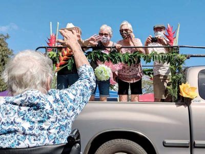- Hale Makua Kahului resident Marjorie Miller (with back to camera) waves to her family as they pass by her in the back of a truck during a Cinco de Mayo parade outside the facility May 5. Hale Makua received the largest federal Paycheck Protection Program loan in Maui County. — Hale Makua photo