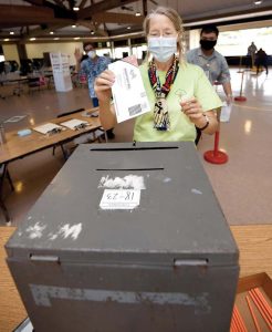 - Share Your Mana founder Lisa Darcy puts a ballot into the ballot box at the Maui County voter service center at Velma McWayne Santos Community Center in Wailuku on Wednesday. Darcy said she was dropping off the ballot for a first-time voter who is unsheltered and without transportation. She said voting is difficult for people who face such challenges. The center will remain open through Saturday, primary election day. Hours through Friday are 8 a.m. to 4:30 p.m.; on Saturday the site will be open until 7 p.m. There also are voter centers at the Mitchell Pauole Center on Molokai and the Lanai Police Station. The Maui News / MATTHEW THAYER photos