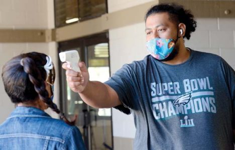 - Maui County voter service center staffer Fine Latu takes a voter’s temperature before she enters the Velma McWayne Santos Community Center on Wednesday.