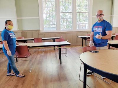 - Seabury Hall sous chef Mae Sawamura and Kitchen Manager David Villanti reconfigure the dining hall at the Olinda school. — Seabury Hall photo