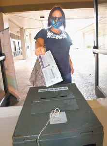 First photo: Wailea resident Zenny Torres drops her ballot into the ballot box at the Maui County voter service center at Velma McWayne Santos Community Center in Wailuku on Tuesday afternoon. “It’s important that we vote,” Torres said. “We don’t want to give up our freedoms.” There are three voter service centers in Maui County: the Velma McWayne Santos Community Center, the Mitchell Pauole Center in Kaunakakai and the Lanai Community Center. All are available for in-person voting, same-day voter registration and ballot drop-offs. They are open from 8 a.m. to 4:30 p.m. through Saturday and on Monday and from 7 a.m. to 7 p.m. Election Day. There also are 12 ballot drop-off boxes around Maui, most accessible 24 hours. For more information visit elections.hawaii.gov.