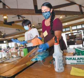 Second photo: Election volunteer Lavinia Vakalahi (right) and election clerk James Mamuad sanitize clipboards and surfaces at the Maui County voter service center at Velma McWayne Santos Community Center in Wailuku on Tuesday afternoon.