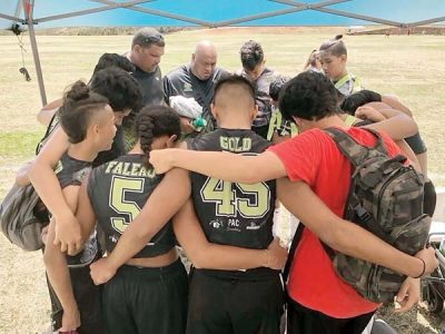 Willie Talamoa (rear center with shaved head) stands next to Kinohi Aki as they pray with players from their 15-and-under flag football team in Honolulu in 2017. A Honolulu community is mourning the loss of Talamoa, a mentor, football coach and father figure who died after contracting COVID-19. Ke‘ala Aki photo via AP