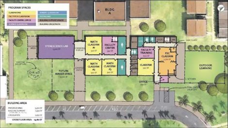 The new one-story facility would cover 14,100 square feet and be built on a grass lawn at the front of the school bordered by portable classrooms to the north, the administration building to the south, a paved driveway and student drop-off area to the east and Classroom Building A to the west.