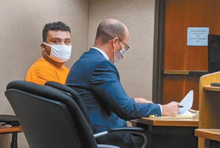 Jose Camacho (left) appears with Deputy Public Defender Ben Lowenthal for a preliminary hearing Wednesday in Wailuku District Court. Camacho was arrested last week when police reported seizing more than 400 pills suspected of containing the opioid fentanyl. The Maui News / LILA FUJIMOTO photo