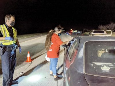 In acknowledgment of the COVID-19 pandemic, there were masks and social distancing at the checkpoint. Mothers Against Drunk Driving volunteers offered goody bags to sober drivers.