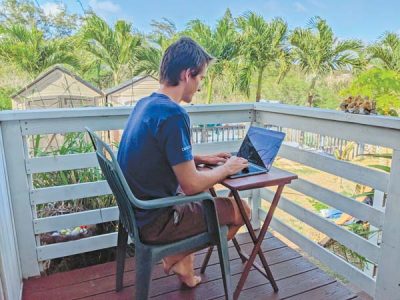Raymond Berger, a New York City software engineer, is pictured working remotely last week in Kahului. A group of state leaders is trying to attract people like Berger to work remotely from Hawaii during the pandemic. Marley C. Alford photo via AP