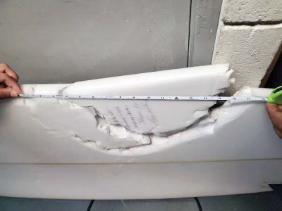 - A tape measure shows a bite mark of about 17 inches on the surfboard of a 56-year-old Lahaina man who was attacked Tuesday morning at Honolua Bay. DLNR photo