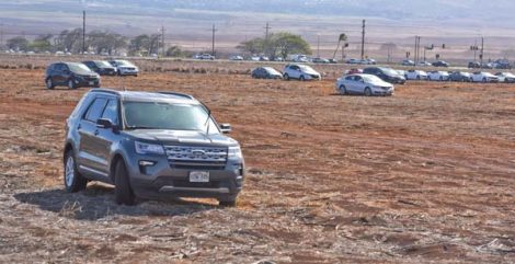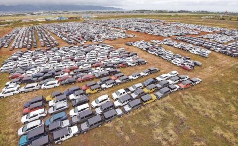 First photo: A former sugar cane field that was tightly packed with thousands of idled rental vehicles in March is thinned to fewer than 100 Friday.