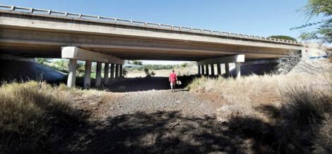 - Andrew Beerer walks down the middle of dry Waipuilani Gulch on Dec. 3. He is part of a Kihei Community Association contingent lobbying to have a pedestrian path built beneath the bridge. The path would augment the crosswalks of the roundabout planned for Piilani Highway at the Kulanihakoi Street intersection servicing the new Kihei high school. — The Maui News / MATTHEW THAYER photo